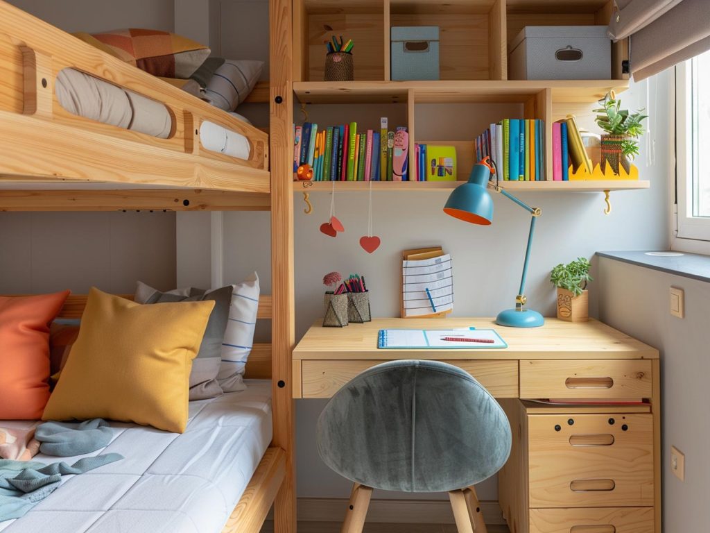 Wybierz meble, które łączą kilka funkcji, np. łóżko z wbudowanym biurkiem lub regał zintegrowany z biurkiem. To oszczędza miejsce i tworzy spójną aranżację.